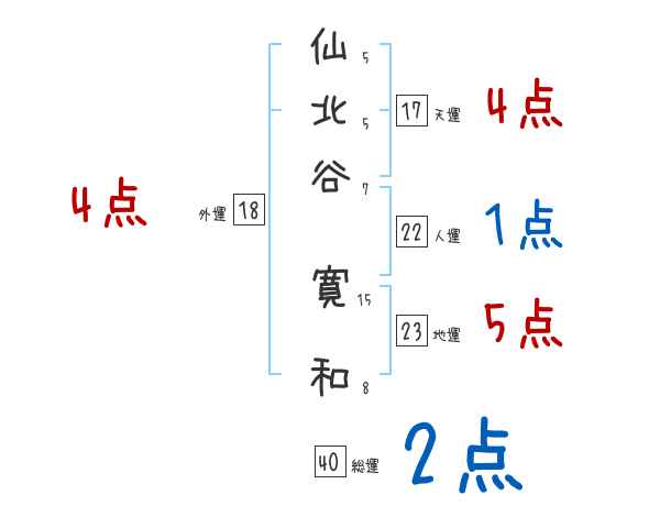 天運![]() | 仙北谷寛和さんの天運は17画の4つ星!積極的な行動力。地位を気づき財産を手に入れる。純粋な心と直感力。 家系が持つ宿命的な運勢を表します。祖先から受け継いだ苗字ですので自分の力が及びません。家柄を象徴します。 |