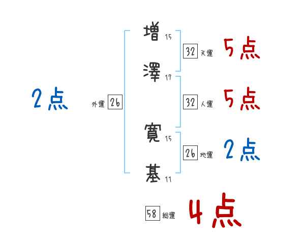 天運![]() | 増澤寛基さんの天運は32画の5つ星!柔軟性があり成功する。チャンスが多く金運が良い。 家系が持つ宿命的な運勢を表します。祖先から受け継いだ苗字ですので自分の力が及びません。家柄を象徴します。 |