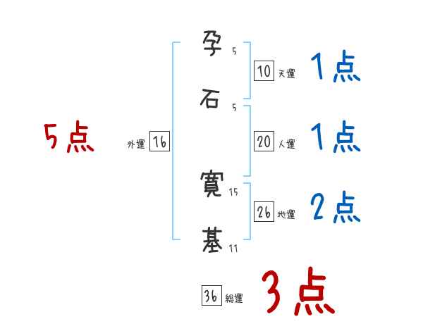 外運![]() | 孕石寛基さんの外運は16画の5つ星!人望が厚く大きく発展する。逆転成功が見える。 生活面を象徴する運勢です。外部から受ける影響力を表し、結婚運、家庭運や職場、環境への順応性を表します。 |
