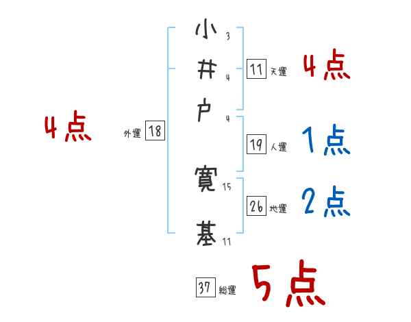 天運![]() | 小井戸寛基さんの天運は11画の4つ星!着実に富や地位を得る幸運な人生。 家系が持つ宿命的な運勢を表します。祖先から受け継いだ苗字ですので自分の力が及びません。家柄を象徴します。 |