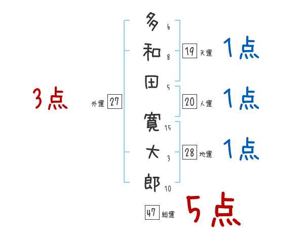 総運![]() | 多和田寛大郎さんの総運は47画の5つ星!実力が開花し発展する円満な人生。財に恵まれる。 あなたの人生を表す1番重要な運勢です。生涯を通じて影響する総合運となり、主に50歳以降の晩年期に影響を及ぼします。 |