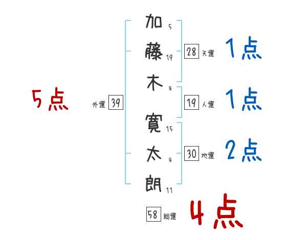 外運![]() | 加藤木寛太朗さんの外運は39画の5つ星!社交性に優れ人望が厚い。人の上に立ち成功する。 生活面を象徴する運勢です。外部から受ける影響力を表し、結婚運、家庭運や職場、環境への順応性を表します。 |