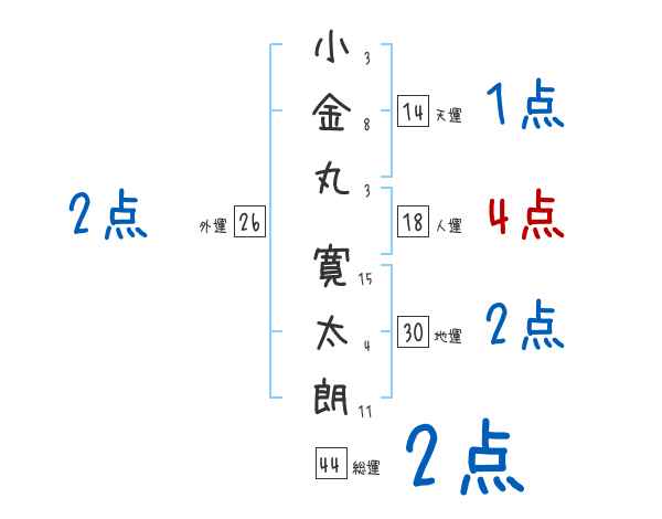 総運![]() | 小金丸寛太朗さんの総運は44画の2つ星!誠実で慎重な性格。物事を考えすぎないように注意しましょう。 あなたの人生を表す1番重要な運勢です。生涯を通じて影響する総合運となり、主に50歳以降の晩年期に影響を及ぼします。 |