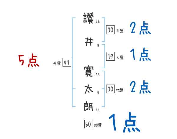 天運![]() | 讃井寛太朗さんの天運は30画の2つ星!浮き沈みの激しさに注意しましょう。 家系が持つ宿命的な運勢を表します。祖先から受け継いだ苗字ですので自分の力が及びません。家柄を象徴します。 |