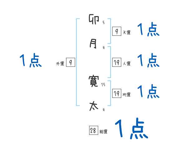 人運![]() | 卯月寛太さんの人運は19画の1つ星!優れた才能を持ちますが、協調性が足りないことも。周りの人と協力する事を意識しましょう。 性格や才能などを表す2番目に重要な運勢です。人間関係や協調性、社会的な成功に影響します。主に20歳から50歳ぐらいまでの中年期の運勢を表します。 |