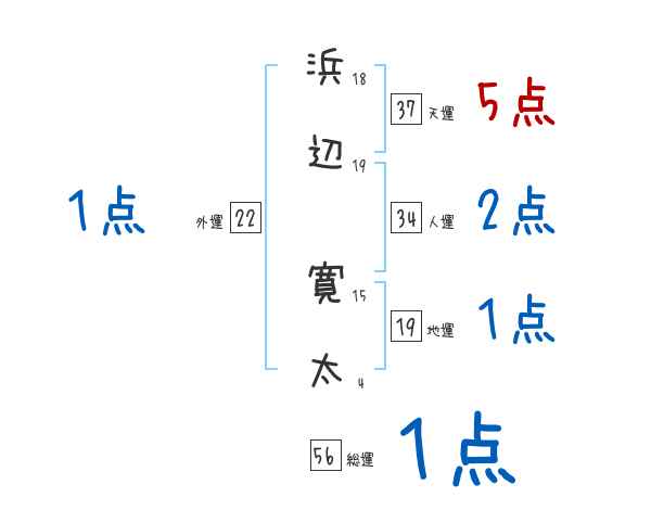 総運![]() | 浜辺寛太さんの総運は56画の1つ星!消極的で無気力になりがち。誠実な気持ちが必要でしょう。 あなたの人生を表す1番重要な運勢です。生涯を通じて影響する総合運となり、主に50歳以降の晩年期に影響を及ぼします。 |