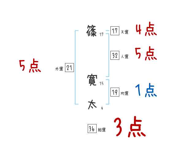 天運![]() | 篠寛太さんの天運は17画の4つ星!積極的な行動力。地位を気づき財産を手に入れる。純粋な心と直感力。 家系が持つ宿命的な運勢を表します。祖先から受け継いだ苗字ですので自分の力が及びません。家柄を象徴します。 |
