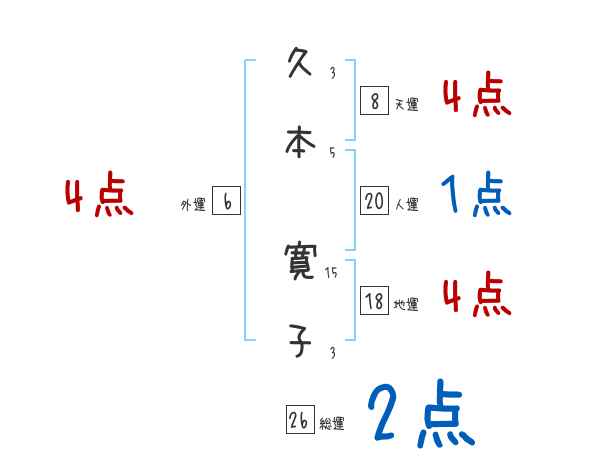 総運![]() | 久本寛子さんの総運は26画の2つ星!波瀾万丈かも。信頼できる人を大事にしましょう。 あなたの人生を表す1番重要な運勢です。生涯を通じて影響する総合運となり、主に50歳以降の晩年期に影響を及ぼします。 |