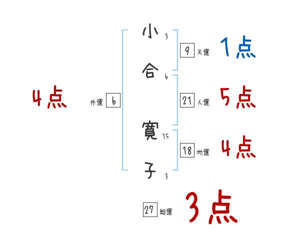 天運![]() | 小合寛子さんの天運は9画の1つ星!消極的で才能を発揮することが苦手なことも。周りの意見に耳を傾けましょう。 家系が持つ宿命的な運勢を表します。祖先から受け継いだ苗字ですので自分の力が及びません。家柄を象徴します。 |