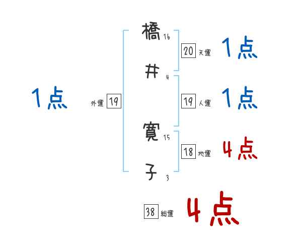 外運![]() | 橋井寛子さんの外運は19画の1つ星!優れた才能を持ちますが、協調性が足りないことも。周りの人と協力する事を意識しましょう。 生活面を象徴する運勢です。外部から受ける影響力を表し、結婚運、家庭運や職場、環境への順応性を表します。 |