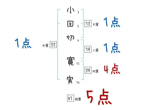 天運![]() | 小田切寛実さんの天運は12画の1つ星!簡単な失敗で諦めてしまいやすいかも。着実に行動すると良いでしょう。 家系が持つ宿命的な運勢を表します。祖先から受け継いだ苗字ですので自分の力が及びません。家柄を象徴します。 |
