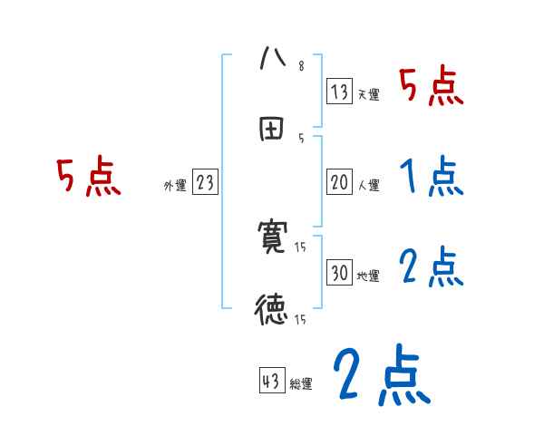 総運![]() | 八田寛徳さんの総運は43画の2つ星!頑固な性格で独立心が強いかも。やや非現実的で浪費に注意しましょう。 あなたの人生を表す1番重要な運勢です。生涯を通じて影響する総合運となり、主に50歳以降の晩年期に影響を及ぼします。 |