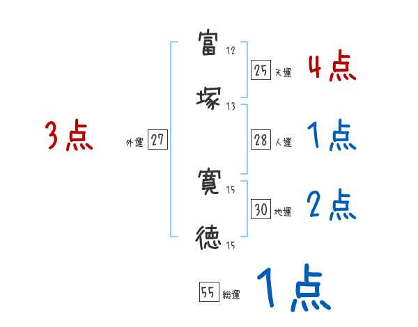天運![]() | 富塚寛徳さんの天運は25画の4つ星!個性があり才能があふれる。強運の持ち主で発展する。 家系が持つ宿命的な運勢を表します。祖先から受け継いだ苗字ですので自分の力が及びません。家柄を象徴します。 |