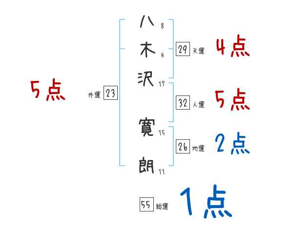 人運![]() | 八木沢寛朗さんの人運は32画の5つ星!柔軟性があり成功する。チャンスが多く金運が良い。 性格や才能などを表す2番目に重要な運勢です。人間関係や協調性、社会的な成功に影響します。主に20歳から50歳ぐらいまでの中年期の運勢を表します。 |