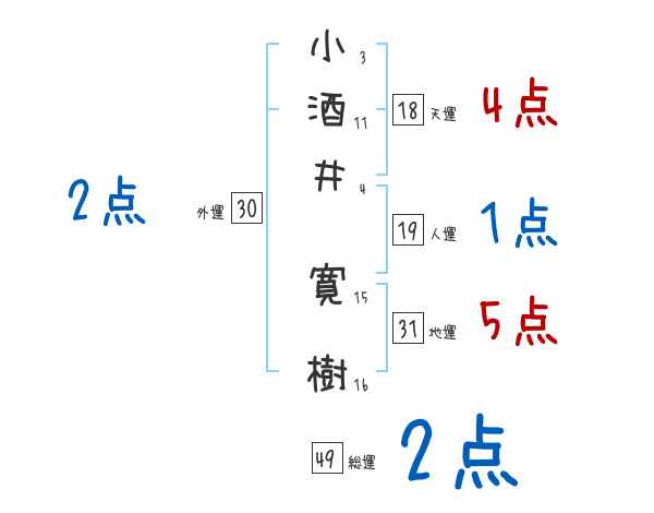 外運![]() | 小酒井寛樹さんの外運は30画の2つ星!浮き沈みの激しさに注意しましょう。 生活面を象徴する運勢です。外部から受ける影響力を表し、結婚運、家庭運や職場、環境への順応性を表します。 |