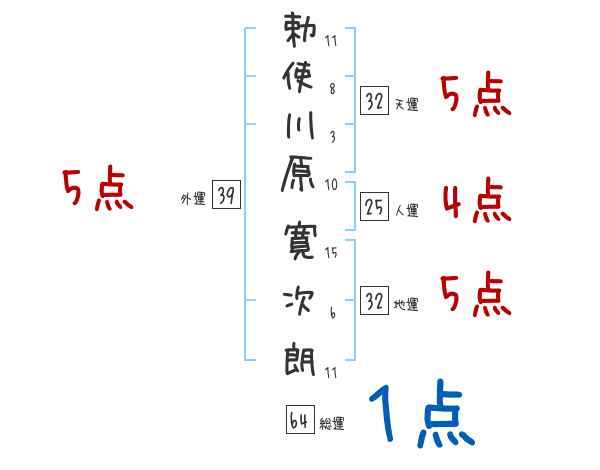 天運![]() | 勅使川原寛次朗さんの天運は32画の5つ星!柔軟性があり成功する。チャンスが多く金運が良い。 家系が持つ宿命的な運勢を表します。祖先から受け継いだ苗字ですので自分の力が及びません。家柄を象徴します。 |