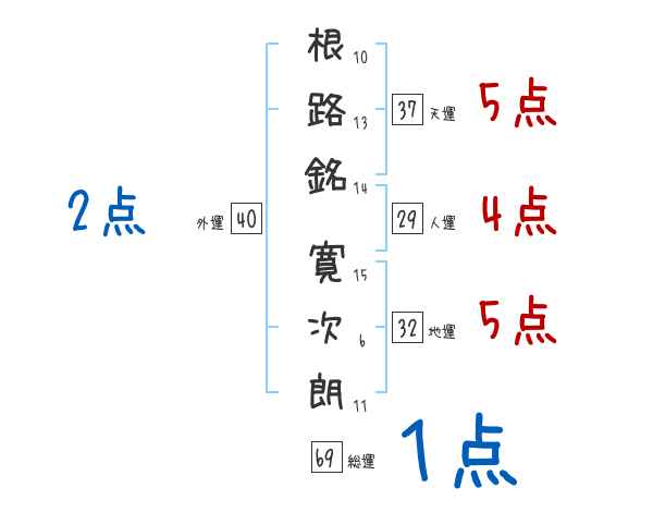 地運![]() | 根路銘寛次朗さんの地運は32画の5つ星!柔軟性があり成功する。チャンスが多く金運が良い。 個性を表す基礎的な運勢です。性格形成や対人関係、行動力など家庭環境に影響されます。主に誕生してから20歳くらいまでの若年期の運勢を表します。 |