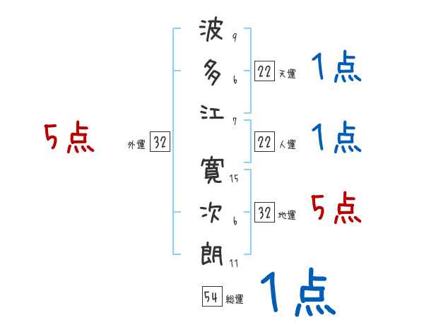 外運![]() | 波多江寛次朗さんの外運は32画の5つ星!柔軟性があり成功する。チャンスが多く金運が良い。 生活面を象徴する運勢です。外部から受ける影響力を表し、結婚運、家庭運や職場、環境への順応性を表します。 |