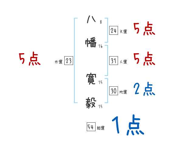 天運![]() | 八幡寛毅さんの天運は24画の5つ星!家庭運が良く順調な人生。金運にも恵まれる。 家系が持つ宿命的な運勢を表します。祖先から受け継いだ苗字ですので自分の力が及びません。家柄を象徴します。 |
