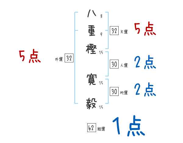 外運![]() | 八重樫寛毅さんの外運は32画の5つ星!柔軟性があり成功する。チャンスが多く金運が良い。 生活面を象徴する運勢です。外部から受ける影響力を表し、結婚運、家庭運や職場、環境への順応性を表します。 |