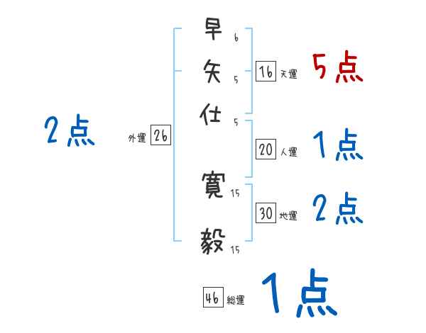 天運![]() | 早矢仕寛毅さんの天運は16画の5つ星!人望が厚く大きく発展する。逆転成功が見える。 家系が持つ宿命的な運勢を表します。祖先から受け継いだ苗字ですので自分の力が及びません。家柄を象徴します。 |