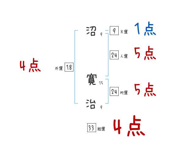 天運![]() | 沼寛治さんの天運は9画の1つ星!消極的で才能を発揮することが苦手なことも。周りの意見に耳を傾けましょう。 家系が持つ宿命的な運勢を表します。祖先から受け継いだ苗字ですので自分の力が及びません。家柄を象徴します。 |