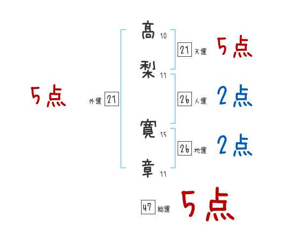 天運![]() | 髙梨寛章さんの天運は21画の5つ星!統率力がある。独立し成功する。名誉を手に入れる。 家系が持つ宿命的な運勢を表します。祖先から受け継いだ苗字ですので自分の力が及びません。家柄を象徴します。 |