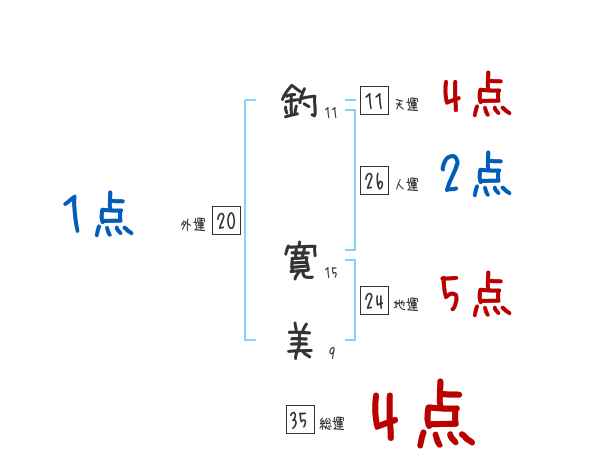 総運![]() | 釣寛美さんの総運は35画の4つ星!温厚な性格で感受性が高い。穏和な性格で人望が厚い。 あなたの人生を表す1番重要な運勢です。生涯を通じて影響する総合運となり、主に50歳以降の晩年期に影響を及ぼします。 |