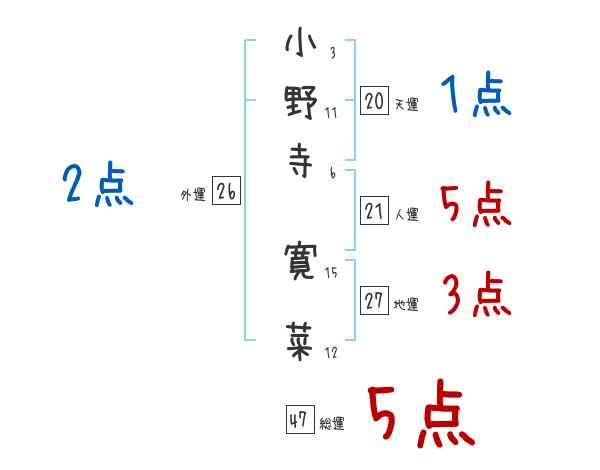 総運![]() | 小野寺寛菜さんの総運は47画の5つ星!実力が開花し発展する円満な人生。財に恵まれる。 あなたの人生を表す1番重要な運勢です。生涯を通じて影響する総合運となり、主に50歳以降の晩年期に影響を及ぼします。 |