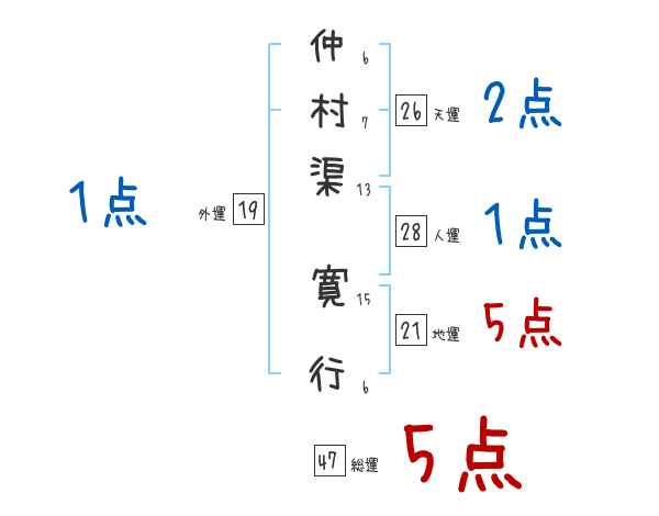 総運![]() | 仲村渠寛行さんの総運は47画の5つ星!実力が開花し発展する円満な人生。財に恵まれる。 あなたの人生を表す1番重要な運勢です。生涯を通じて影響する総合運となり、主に50歳以降の晩年期に影響を及ぼします。 |