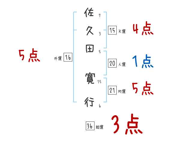 | 外運  | 佐久田寛行さんの外運は16画の5つ星!人望が厚く大きく発展する。逆転成功が見える。生活面を象徴する運勢です。外部から受ける影響力を表し、結婚運、家庭運や職場、環境への順応性を表します。 |
