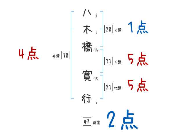 | 総運  | 八木橋寛行さんの総運は49画の2つ星!不安定な性格で明暗がある人生。周りの人には支援されやすい。あなたの人生を表す1番重要な運勢です。生涯を通じて影響する総合運となり、主に50歳以降の晩年期に影響を及ぼします。 |
