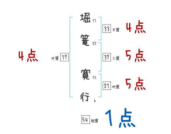 外運![]() | 堀篭寛行さんの外運は17画の4つ星!積極的な行動力。地位を気づき財産を手に入れる。純粋な心と直感力。 生活面を象徴する運勢です。外部から受ける影響力を表し、結婚運、家庭運や職場、環境への順応性を表します。 |