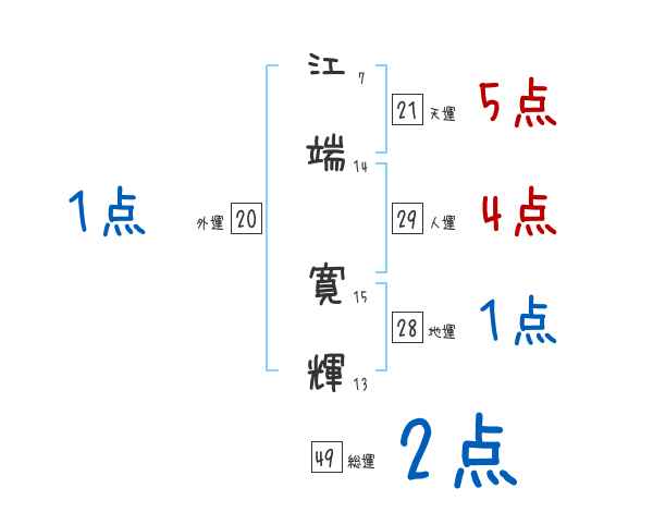 天運![]() | 江端寛輝さんの天運は21画の5つ星!統率力がある。独立し成功する。名誉を手に入れる。 家系が持つ宿命的な運勢を表します。祖先から受け継いだ苗字ですので自分の力が及びません。家柄を象徴します。 |