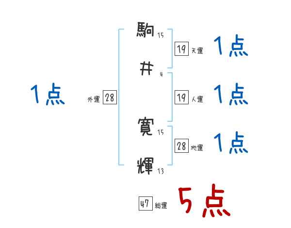 総運![]() | 駒井寛輝さんの総運は47画の5つ星!実力が開花し発展する円満な人生。財に恵まれる。 あなたの人生を表す1番重要な運勢です。生涯を通じて影響する総合運となり、主に50歳以降の晩年期に影響を及ぼします。 |