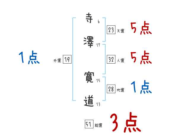 天運![]() | 寺澤寛道さんの天運は23画の5つ星!想像力に優れ活力がある。一代で成功し名誉を手に入れる。 家系が持つ宿命的な運勢を表します。祖先から受け継いだ苗字ですので自分の力が及びません。家柄を象徴します。 |
