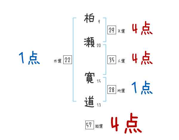 天運![]() | 柏瀬寛道さんの天運は29画の4つ星!完全主義で才能がある。厳格な心の持ち主。 家系が持つ宿命的な運勢を表します。祖先から受け継いだ苗字ですので自分の力が及びません。家柄を象徴します。 |