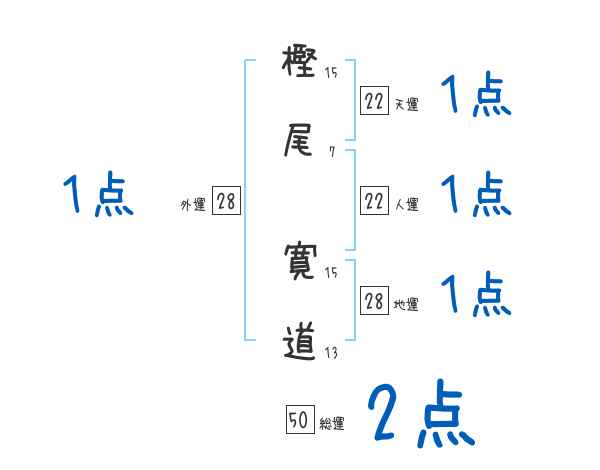 人運![]() | 樫尾寛道さんの人運は22画の1つ星!努力することが苦手ないっぽう手先が器用。芸術性にも優れる。 性格や才能などを表す2番目に重要な運勢です。人間関係や協調性、社会的な成功に影響します。主に20歳から50歳ぐらいまでの中年期の運勢を表します。 |