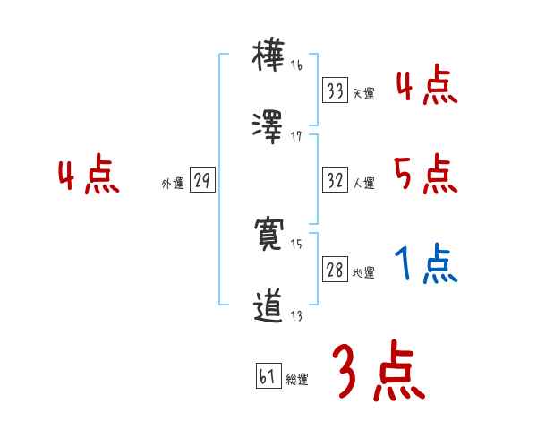 人運![]() | 樺澤寛道さんの人運は32画の5つ星!柔軟性があり成功する。チャンスが多く金運が良い。 性格や才能などを表す2番目に重要な運勢です。人間関係や協調性、社会的な成功に影響します。主に20歳から50歳ぐらいまでの中年期の運勢を表します。 |