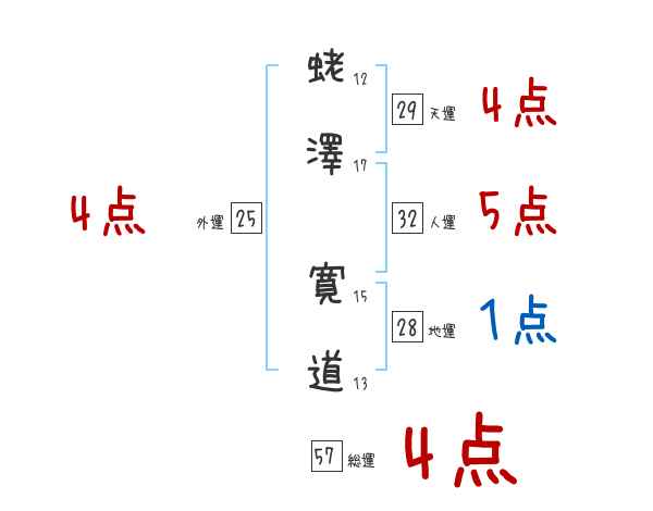 天運![]() | 蛯澤寛道さんの天運は29画の4つ星!完全主義で才能がある。厳格な心の持ち主。 家系が持つ宿命的な運勢を表します。祖先から受け継いだ苗字ですので自分の力が及びません。家柄を象徴します。 |