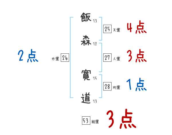 総運![]() | 飯森寛道さんの総運は53画の3つ星!やや見栄っ張りで虚栄心がある。散財に注意。 あなたの人生を表す1番重要な運勢です。生涯を通じて影響する総合運となり、主に50歳以降の晩年期に影響を及ぼします。 |