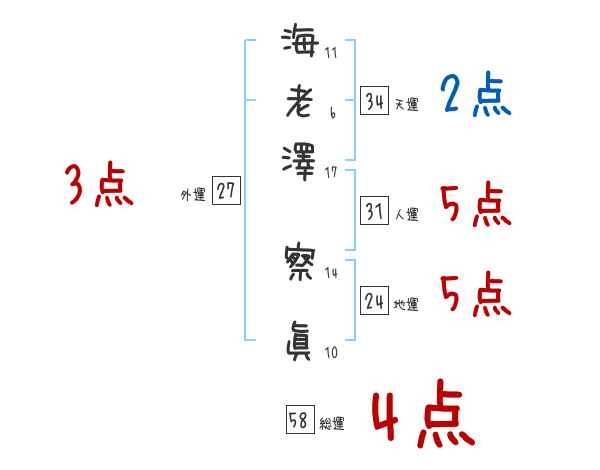 天運![]() | 海老澤察眞さんの天運は34画の2つ星!独創性に優れるが、自尊心が強く災難に注意しましょう。 家系が持つ宿命的な運勢を表します。祖先から受け継いだ苗字ですので自分の力が及びません。家柄を象徴します。 |