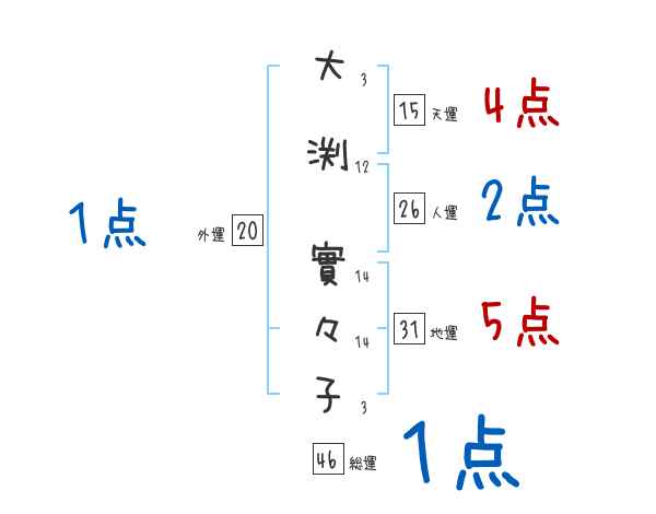 総運![]() | 大渕實々子さんの総運は46画の1つ星!迷走することが多く苦労するかも。目先のことにとらわれないように。 あなたの人生を表す1番重要な運勢です。生涯を通じて影響する総合運となり、主に50歳以降の晩年期に影響を及ぼします。 |