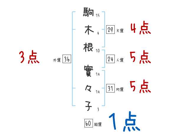 地運![]() | 駒木根實々子さんの地運は31画の5つ星!社交性があり判断力に優れる。順風満帆な人生で円満な生活。 個性を表す基礎的な運勢です。性格形成や対人関係、行動力など家庭環境に影響されます。主に誕生してから20歳くらいまでの若年期の運勢を表します。 |