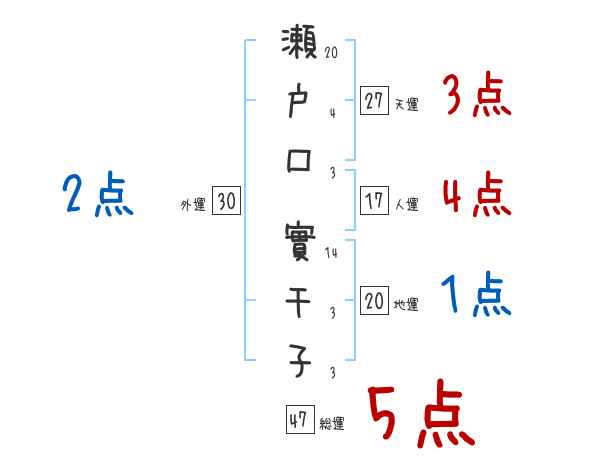 天運![]() | 瀬戸口實千子さんの天運は27画の3つ星!頭脳明晰だが強情で摩擦が多い傾向。孤立に注意。 家系が持つ宿命的な運勢を表します。祖先から受け継いだ苗字ですので自分の力が及びません。家柄を象徴します。 |