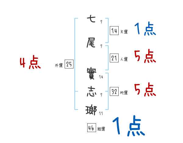 天運![]() | 七尾實志瑯さんの天運は14画の1つ星!人に対して優しいがストレスを溜め込みがち。人間関係のトラブルを避けるよう気をつけましょう。 家系が持つ宿命的な運勢を表します。祖先から受け継いだ苗字ですので自分の力が及びません。家柄を象徴します。 |