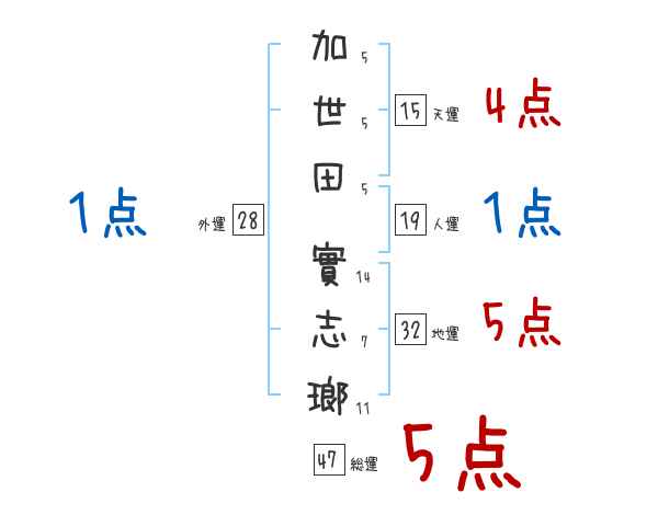 外運![]() | 加世田實志瑯さんの外運は28画の1つ星!家庭環境に注意。スポーツで活躍できる能力があるかも。 生活面を象徴する運勢です。外部から受ける影響力を表し、結婚運、家庭運や職場、環境への順応性を表します。 |