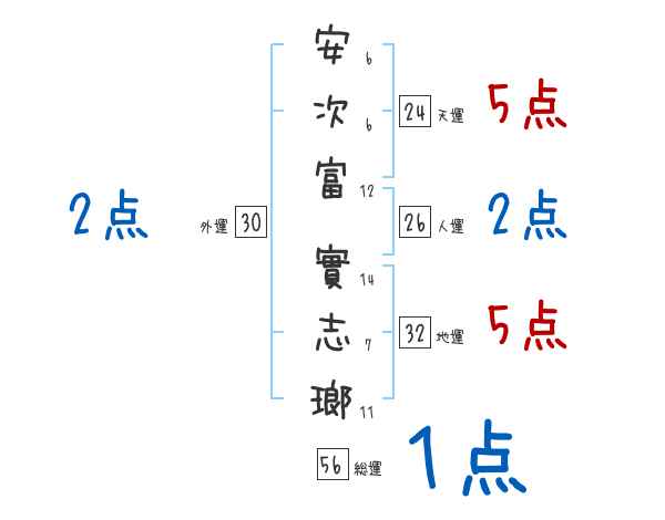 天運![]() | 安次富實志瑯さんの天運は24画の5つ星!家庭運が良く順調な人生。金運にも恵まれる。 家系が持つ宿命的な運勢を表します。祖先から受け継いだ苗字ですので自分の力が及びません。家柄を象徴します。 |