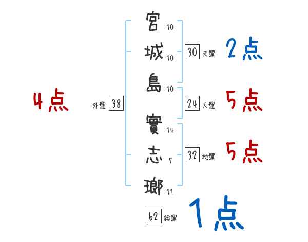 地運![]() | 宮城島實志瑯さんの地運は32画の5つ星!柔軟性があり成功する。チャンスが多く金運が良い。 個性を表す基礎的な運勢です。性格形成や対人関係、行動力など家庭環境に影響されます。主に誕生してから20歳くらいまでの若年期の運勢を表します。 |