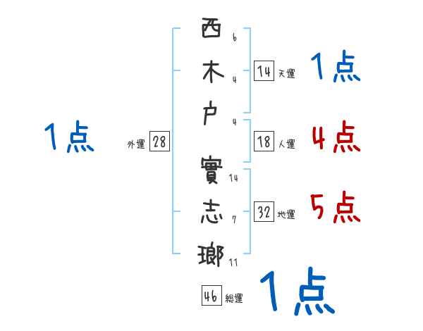外運![]() | 西木戸實志瑯さんの外運は28画の1つ星!家庭環境に注意。スポーツで活躍できる能力があるかも。 生活面を象徴する運勢です。外部から受ける影響力を表し、結婚運、家庭運や職場、環境への順応性を表します。 |